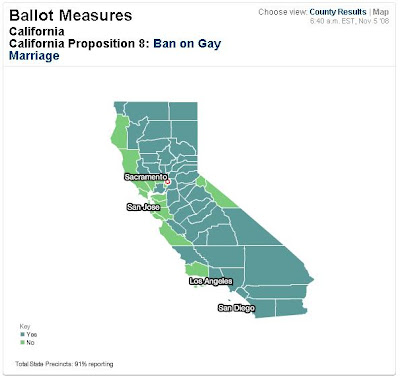 Good job California for standing up for what you believe and having your voices be heard. I updated this map all night long and felt confident for most of the night. The 52% win was a little close, but a win is a win. I know this is all about population but it makes my heart happy to see that most of the acreage of California supports traditional marriage. I'm glad that the county I come from also passed Prop. 8 with a resounding YES! I hope that we may all be able to live with respect for each other and others beliefs. I'm sure the fight isn't over, but for now we may live in peace and enjoy the God ordained definition of marriage. I wish nothing but the best for those that are struggling to accept this law. I hope the opposition can understand that we also were just fighting for what we believe in, and luckily this time the majority sided with us. Congratulations California!